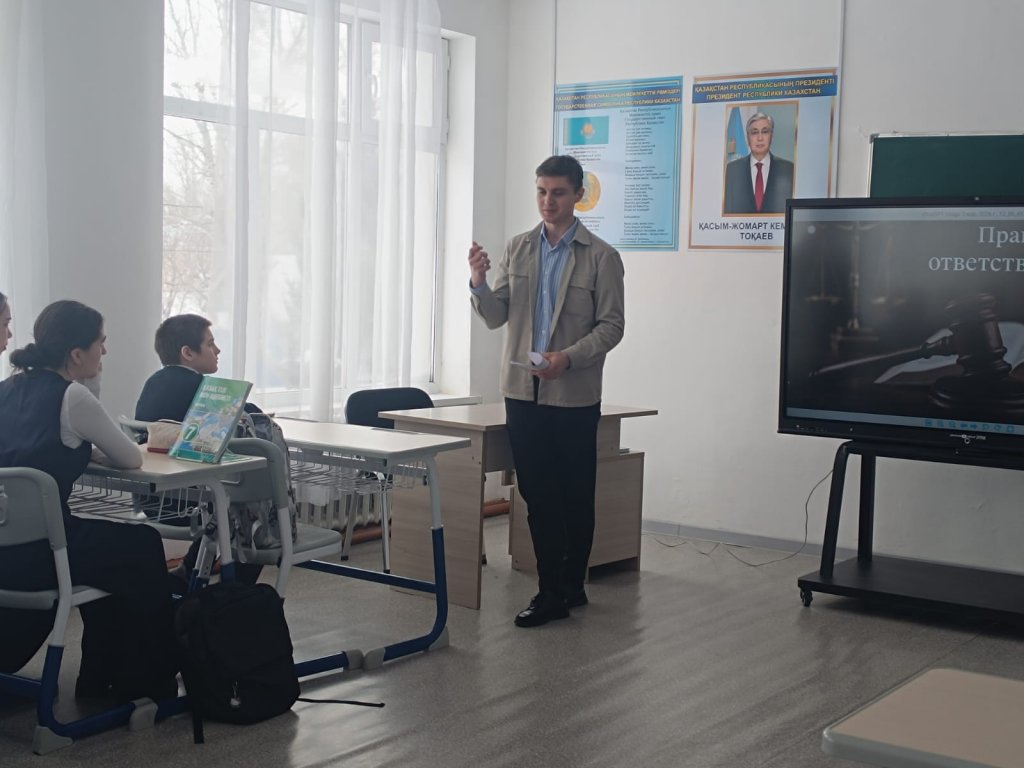 Кездесу барысында заң алдындағы жауапкершілік ұғымы, құқық бұзушылық түрлері және олардың салдары талқыланды. Оқушыларға өз іс-әрекеттері үшін жауапкершілік алу, заң талаптарын...
